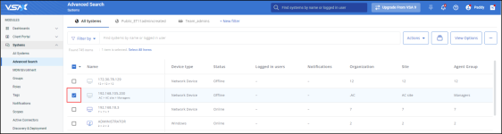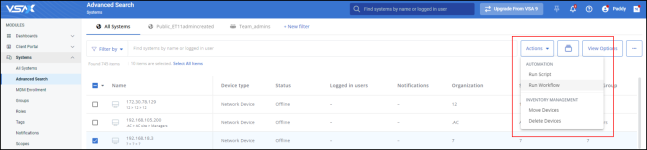 The bulk actions can be accessed from the Actions menu, which will be enabled when at least one device has been selected on the Advanced Search page:
