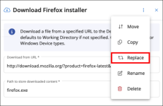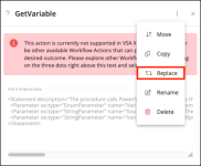 Workflow actions can now be replaced with any other action in the editor. This makes it easier to quickly edit a translated VSA 9 Agent Procedure where some workflow actions may be marked red, not currently supported. It also improves the general workflow editing experience, swapping any current action with a few simple clicks.
