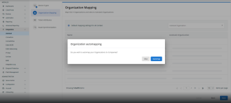 The first time a user enters the Organization Mapping step (initial setup) of the Autotask integration wizard, a pop-up prompt will suggest auto-mapping top-level organizations.