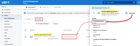 This new column is filterable and also searchable within quick search in the top navigation bar. For agented devices, this name represents the device name retrieved by the audit process.