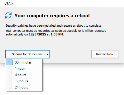 - When enabled, end users receive a prompt as soon as a reboot is required by a policy-driven patch deployment, rather than waiting for a defined notification window of up to 23 hours before the reboot deadline.
