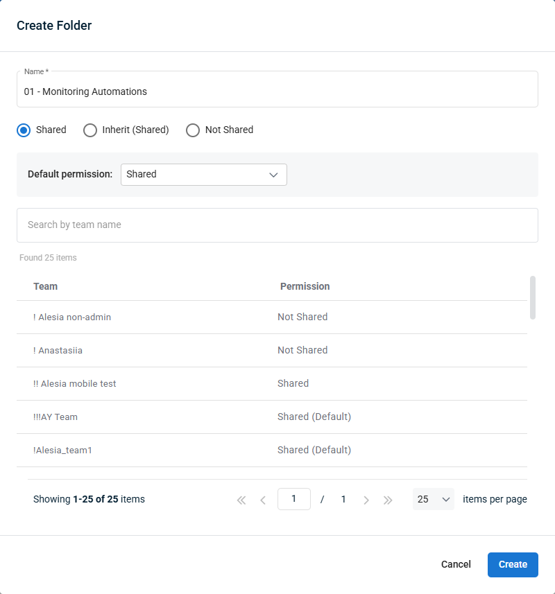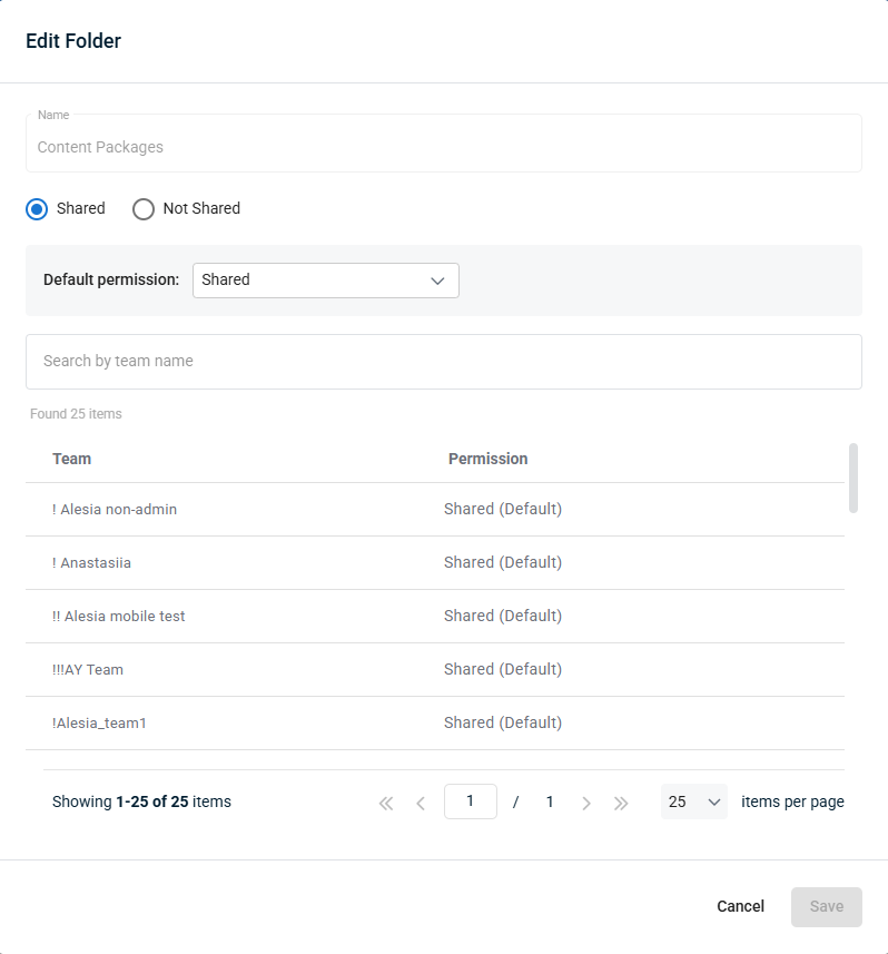 Shared: Allows you to share the folder with teams other than the Administrators team.