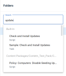 Using the Search function will search all of the objects within the Automation Hub, and display all items that contain your search, separated by location, and labeled with their object type (Script, Task, Workflow, Workflow Template or Managed File)