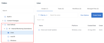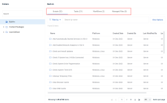 When a folder is selected, you can view it's contents. The contents of each folder are separated into four tabs: Scripts, Tasks, Workflows, and Managed Files. The number next to the name of each tab shows how many objects of that type are in that folder.