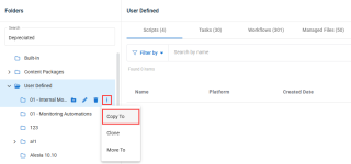 The Copy To tool allows you to copy a folder from anywhere in the Automation Hub and save it to anywhere within the User Defined folder. This is useful if you want to modify any built-in workflows to better suit your needs.