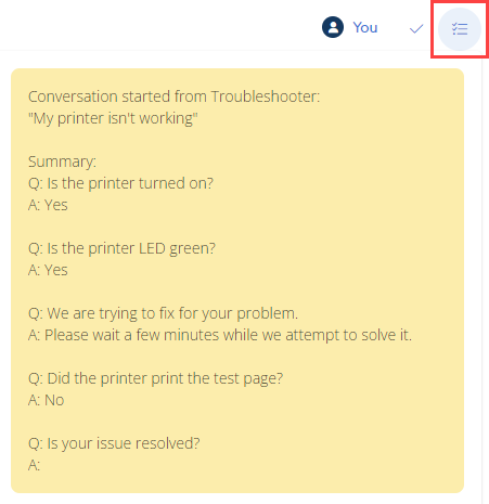 In the upper-right corner of a conversation initiated by a troubleshooter, a summary of the troubleshooter responses that triggered the creation of the conversation is continuously available for reference. Refer to Starting a conversation in Client Portal troubleshooters. |
