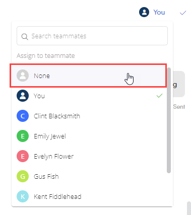 To assign an unassigned conversation to yourself or another team member in the VSA 10 account, click Unassigned in the upper-right corner of the conversation and select either You or another user account from the list. Use the Search teammates search box to search for a specific user's name, and the results will be narrowed as you type. The name of the conversation assignee will replace Unassigned. If a conversation is already assigned, you can change the assignee at any time using the drop-down menu. You can also assign an unassigned conversation to yourself by simply sending a message in that conversation. Assigning conversations to yourself allows you to filter conversations by those that are assigned to you. For details, refer to Assigned to me. |