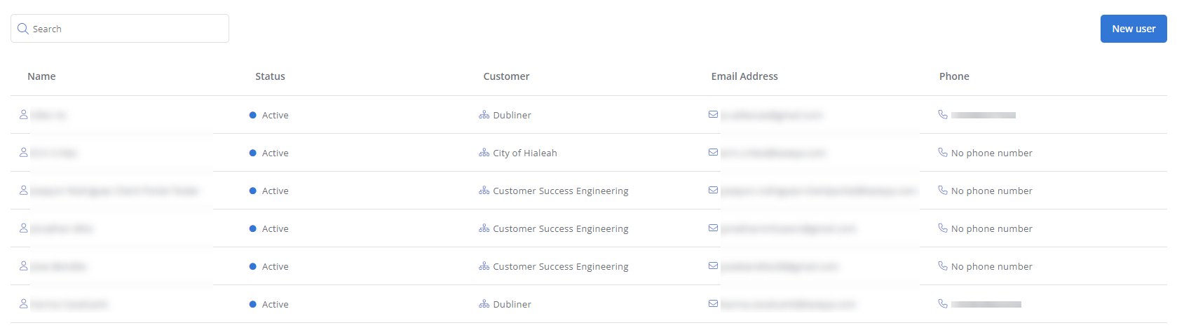 | New user | Click New user to add a new end user to your Client Portal. Refer to Create or edit an end user account. |