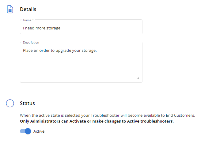 Field Description Name Enter a name for the troubleshooter. Description Optionally, enter a brief description for the troubleshooter. Status Turn the toggle on or off to make the troubleshooter active or inactive, respectively.