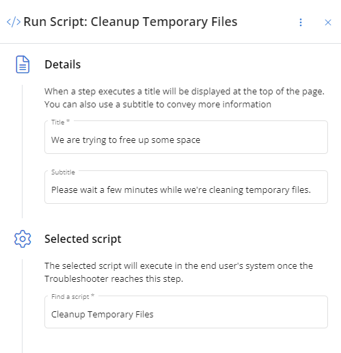 | Find a script | Select a script to be executed on the end user's device once the troubleshooter reaches this step. Refer to Scripts. |