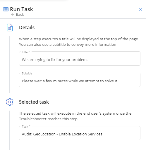 | Task | Select a task to be executed on the end user's device once the troubleshooter reaches this step. Refer to Tasks. |