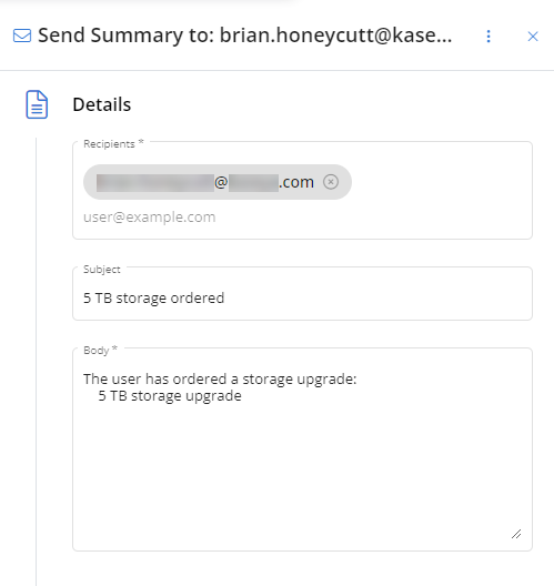 | Recipients | Enter one or more email addresses to receive the message when the step is executing. |