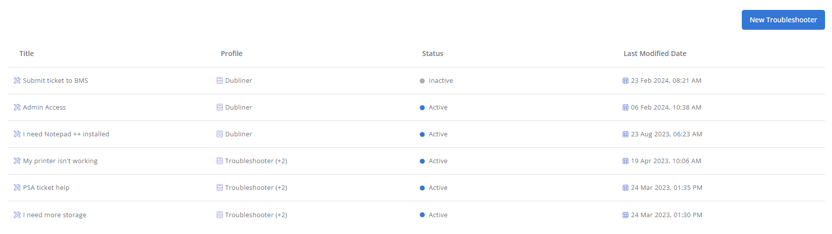 Newly created troubleshooters are added to the list of troubleshooters on the Troubleshooters page.