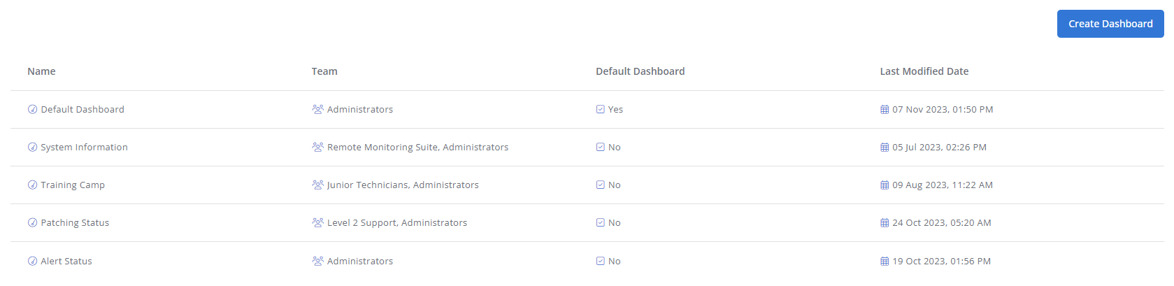 Administrators can navigate to Dashboards > Manage to view a list of dashboards in the account.