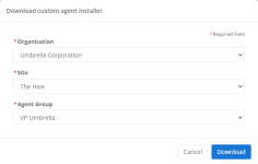 Depending on the device type selected, you may be prompted to select the Organization, Site, and Agent Group with which the download corresponds. These values are required for VSA 10 to build the installer. When you're ready to proceed, click Download.