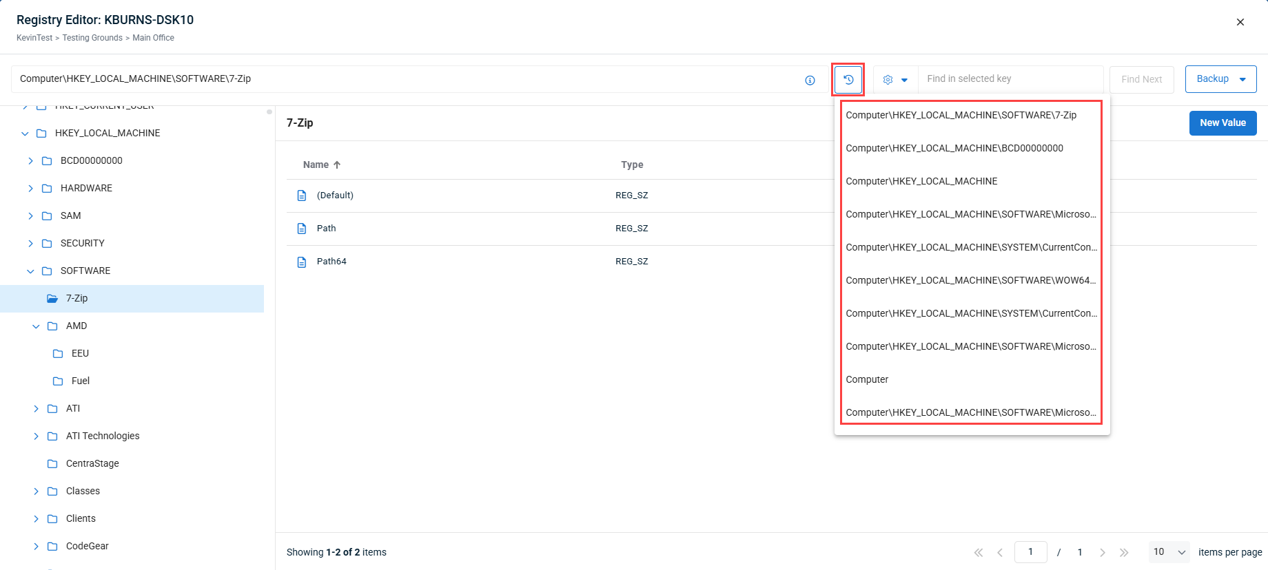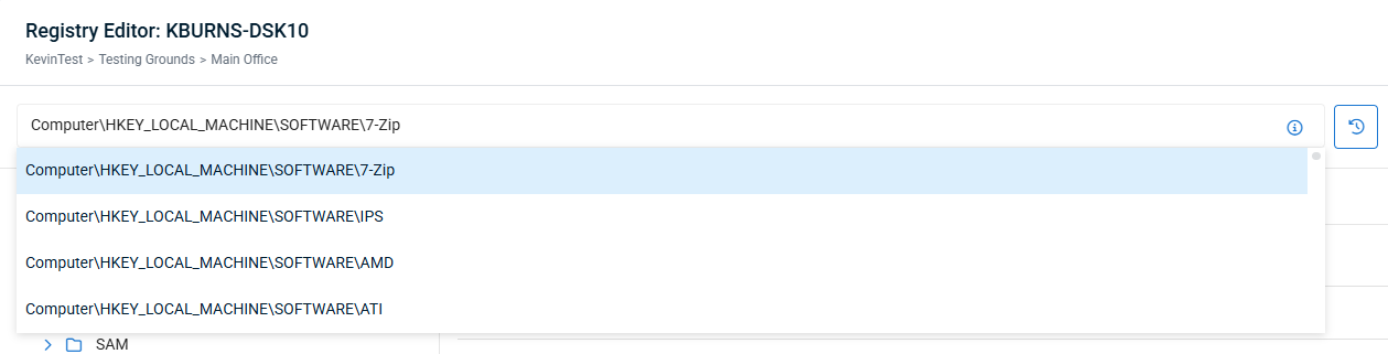 | Registry Viewer | Allows users to navigate and view the registry of the target device. Previously viewed registry keys can easily be recalled using the Navigation History icon in the upper right hand corner. |