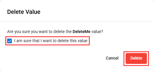 - In the Delete Value pop-up that appears, check the box next to I am sure that I want to delete this value and click Delete to confirm deletion and close the pop-up.
