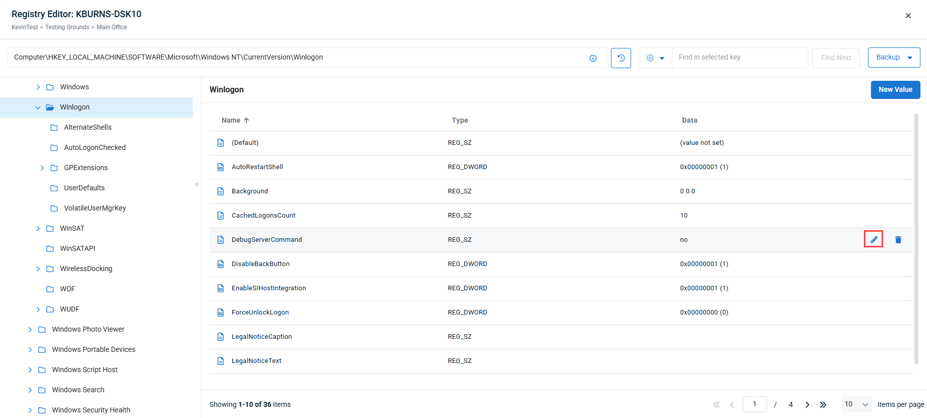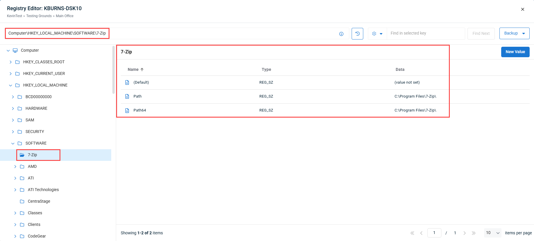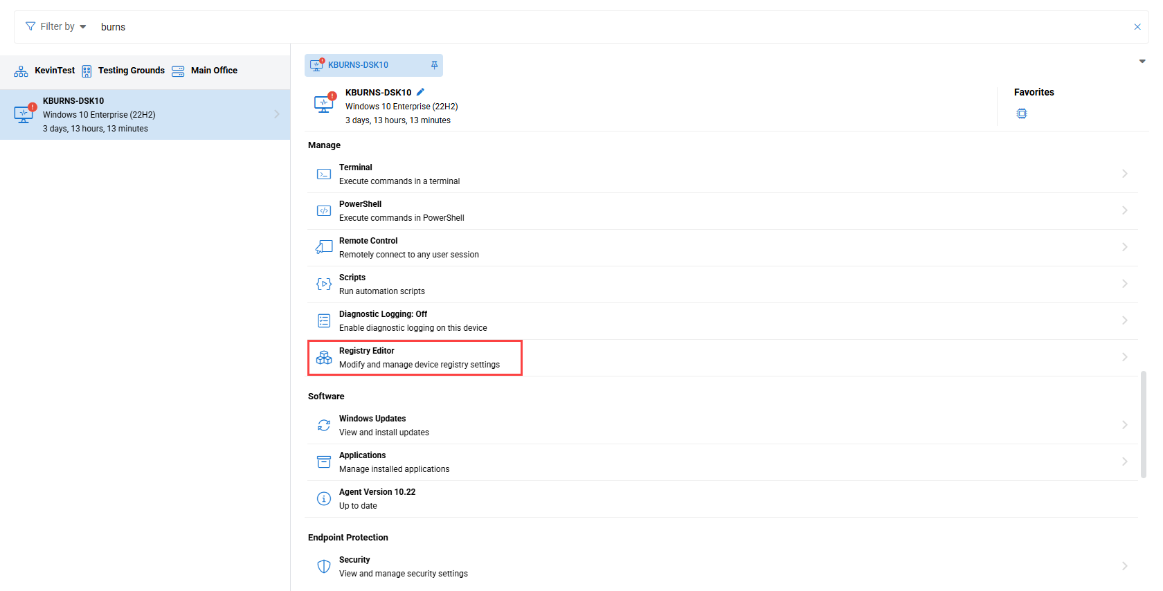 Technicians can view and edit the registry of Windows devices directly from the device card at Devices > Device List > Manage > Registry Editor, without requiring a remote desktop session or interrupting the end user.
