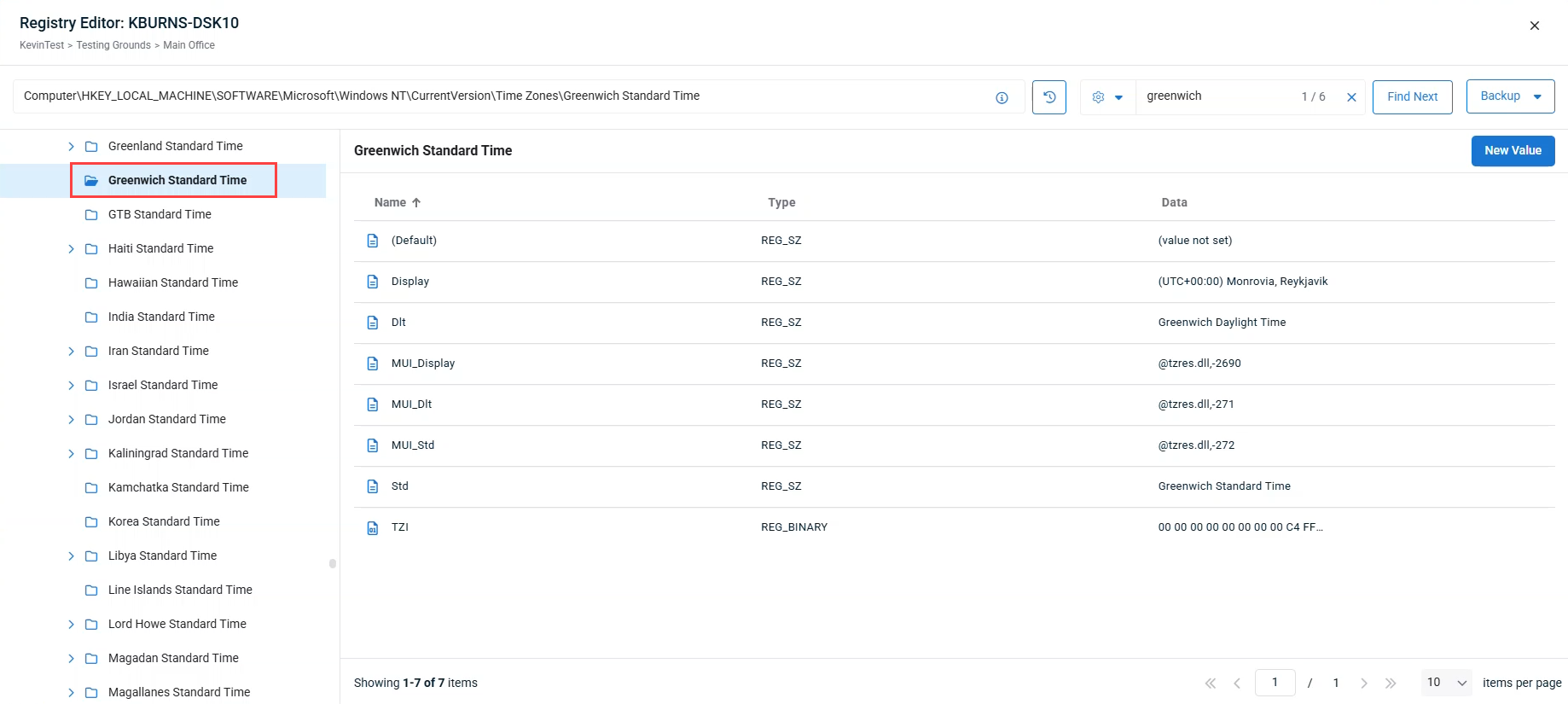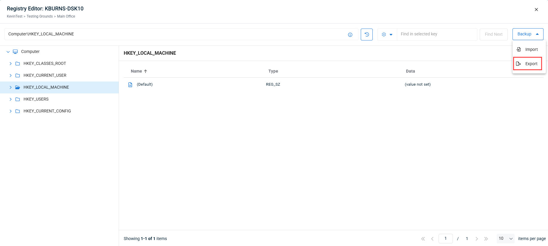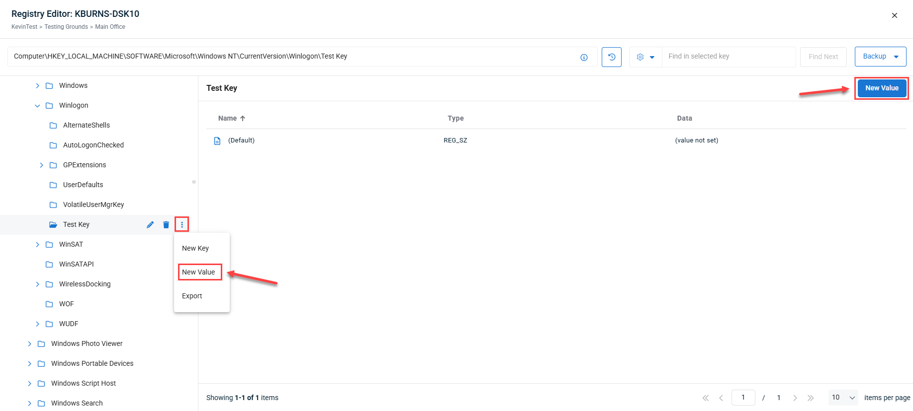 Technicians can view and edit the registry of Windows devices directly from the device card at Devices > Device List > Manage > Registry Editor, without requiring a remote desktop session or interrupting the end user.