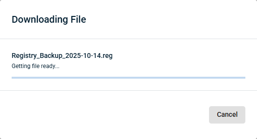 - The Downloading File window will appear, with a progress bar. When the progress bar has completed, the window will close and the registry backup will download to your browser's default download location.