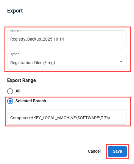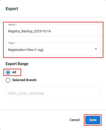 - In the Export window that appears, change the name if needed, select the export file type (.reg or .txt) and ensure the Export Range is set to All. Click Save when finished to initiate the download and close the Export window.