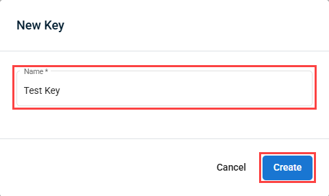 - In the New Key window that appears, enter a name for the key, and click Create to create the key and close the pop-up.