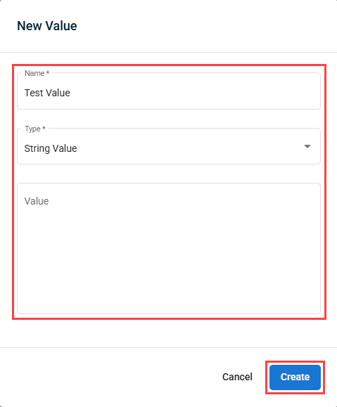 - In the New Value window that appears, enter a name for the value, select the value type, enter the value data if needed, and click Create to create the value and close the pop-up.