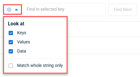 Before performing a search, you can optionally view and configure the search options using the gear icon to the left of the search bar. You can then select the checkboxes that correspond to the entities within the registry you wish to search, selecting any combination of Keys, Values, and/or Data. You can also choose whether you want your search to only include results that match the full search string.