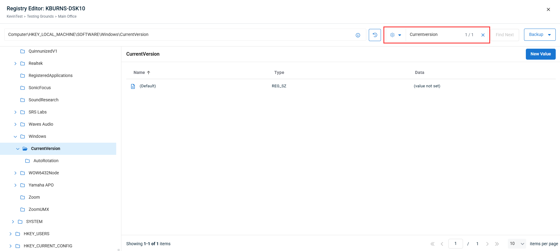 - The first search result will show, with the Registry Editor automatically navigating you to where it is located, and bolding the text of the relevant key or value.