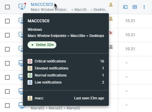 Like the Device List, you can quickly indicate the device type, if the device has any open notifications, as well as if the device is online or offline, by viewing the device icon. The Device and status icons page breaks down the different icons in detail.