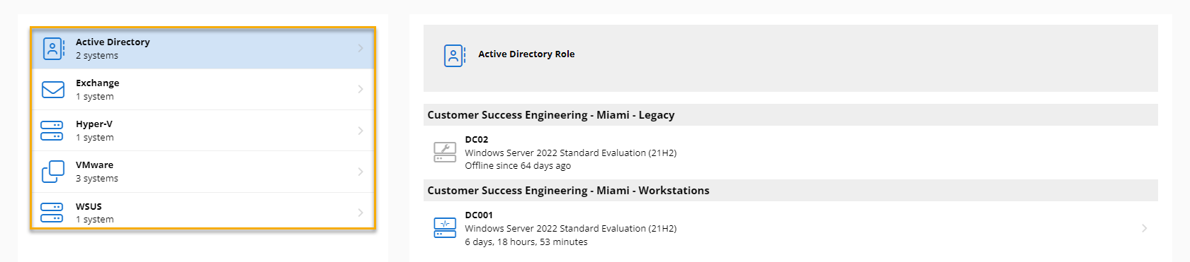 The Roles page enumerates all devices in your environment that fill a hosting role, aggregating them by the service they provide. From this page, you can access status information about the host and details about its services.