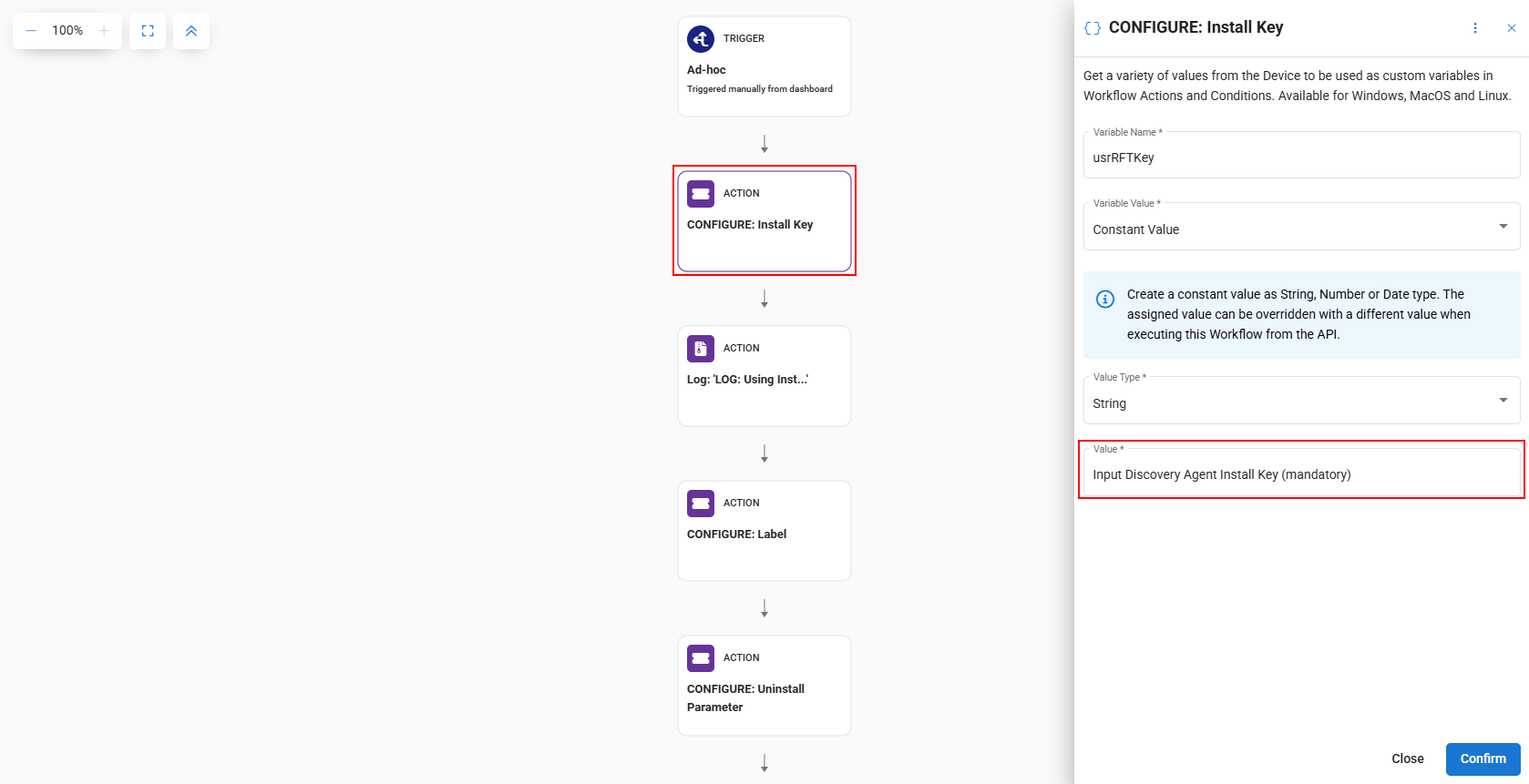 - Click the CONFIGURE: Install Key action to add the Install Key value with the key you copied from RapidFire Tools.