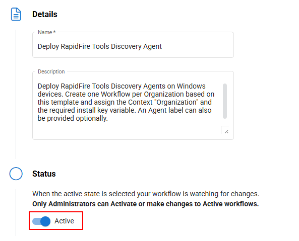 - In the Status section, turn on the Active toggle to activate the workflow.