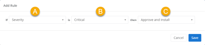Rule hierarchy | This table enumerates all global OS rules and third-party software rules in effect for your environment, ordered by priority. VSA 10 consults these rules first when analyzing a newly-discovered patch. They supersede all other rules and apply in a top-down order. You can set various criteria, such as patch name, description, category, or severity metrics, to approve or reject the patch. Common use cases for global rules include excluding drivers or patches with known deployment issues. If a patch doesn't meet any global rules criteria, VSA 10 will next evaluate it by patch policy rules. |