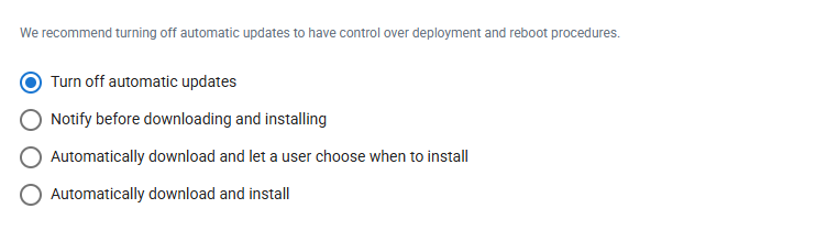 - We recommend using the Managed OS and Software Patching policy type, which turns off automatic updates and enables access to the OS Rules module, to have full control over deployment and reboot procedures.