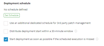 Distribute deployment start within a 30-minute window | Enabling this option adds a random delay (max 30 minutes) to the scheduled execution time. |