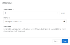 Using the Set Schedule button, you can configure how often and when Patch Management notifications will be sent to the account.