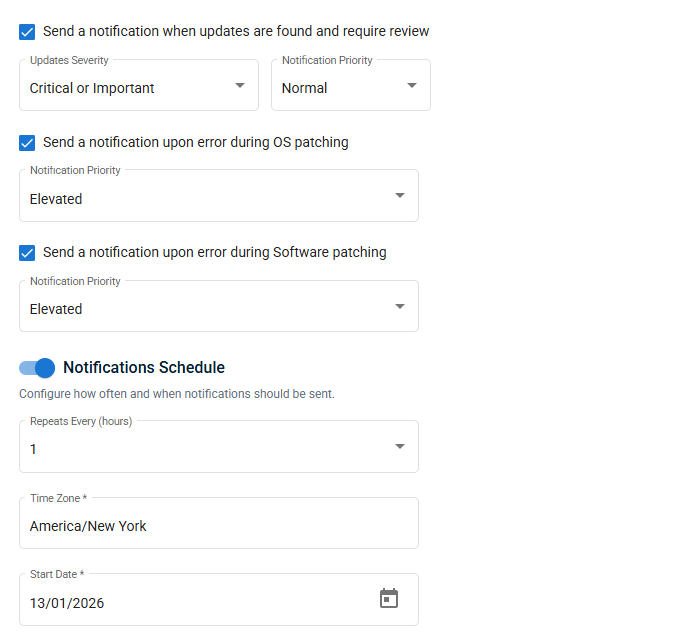 | Notifications Schedule | Configure how often and when Patch Management notifications will be sent. When enabled, you can configure the following options: