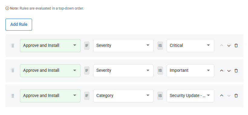 You can add any number of update rules. VSA 10 will evaluate them in a top-down order, and when a rule matches the update, the evaluation will stop and that rule's action will apply. You can click and drag rules using the braille icon on the left to reposition them, or use the arrows on the right to change the rules position.