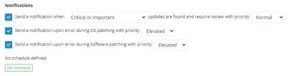 Send a notification upon error during Software patching with priority... | Select the check box to trigger a notification of Low, Normal, Elevated, or Critical priority when an error occurs during the software patching process. Refer to 3rd Party Software Rules and Device notifications. |