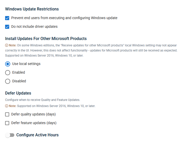 - Windows Settings: Customize Windows Update settings, including deferring updates and controlling which update types are installed across managed devices.