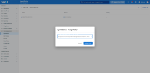 - In the Agent Status modal that opens, select a policy to assign from the drop-down menu. Then, click Assign Policy or Apply Policy Update. You can also assign policies directly to organizations, sites, and agent groups via Configuration > Organizations.