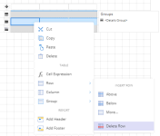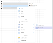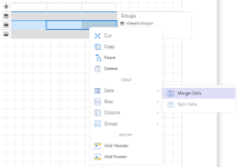 Alternately, you can add a group by selecting the Group > Insert Group option from the context menu. - Merge the cells in the Group Header row by selecting the Cells > Merge Cells option from the context menu and enter the following expression in the Value property as "PolicyType =".