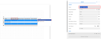 - Drag and drop the desired field from the Data tab to the Groups pane. This adds a Group Header and Footer above and below the details row as shown and sets the Grouping Expression property to in the Properties pane.