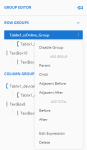 The Group Editor in the report toolbox shows the row and column hierarchies for the currently selected tablix data region. It also provides you options to add nested and adjacent groups to the chosen group in the editor.