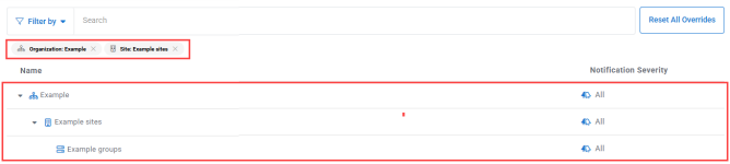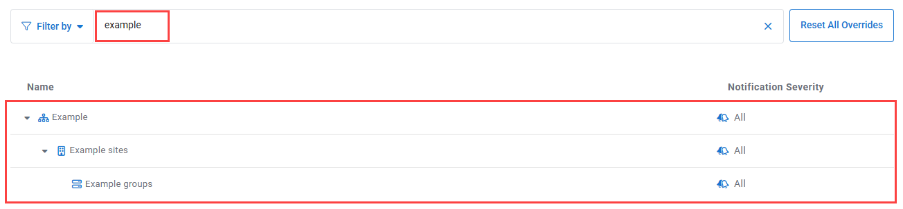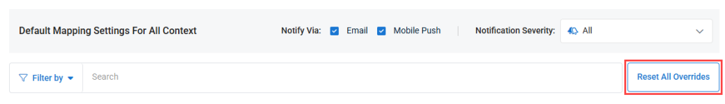 Click Reset All Overrides, located to the right of the search bar, to restore the default settings. The default configuration is set to send notifications for system alerts of all priority levels from all organizations, sites, and agent groups.