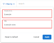 To apply a filter to the page, click the Filter By option and type in or the drop-downs in the Organization and Site fields to select which organization and, optionally, site you want to filter the page results by.