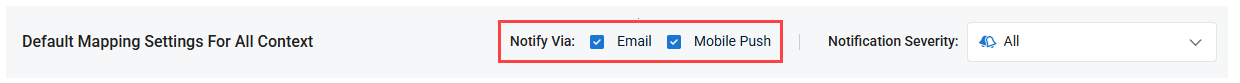 In the Default Mapping Settings For All Context section at the top of the page, you can enable Email and Mobile Push to configure your user account to receive email notifications, push notifications, both types of notifications, or neither, in the Notify Via options.