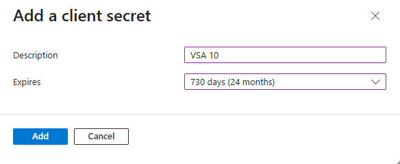 Enter a description for the new client secret, and set the expiration to 730 days (24 months). Click Add.
