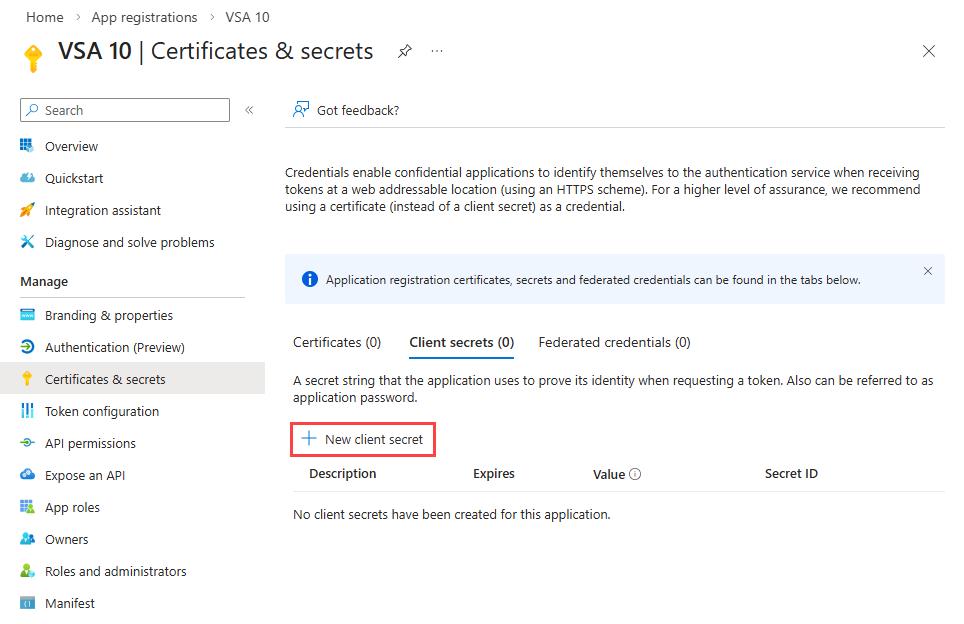 Select the Client secrets tab, and click New client secret.